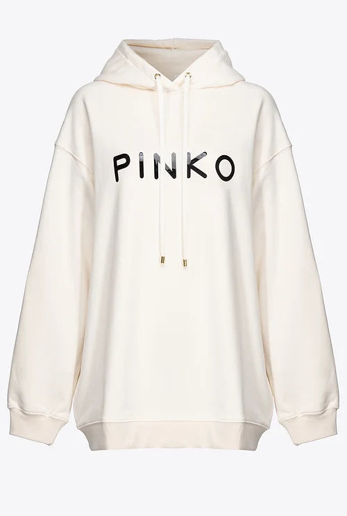 Felpa dal taglio oversize in cotone con stampa maxi lettering PINKO effetto lucido davanti. Collo a cappuccio con coulisse, maniche lunghe a giro leggermente basso, polsini e fondo capo con elastico.