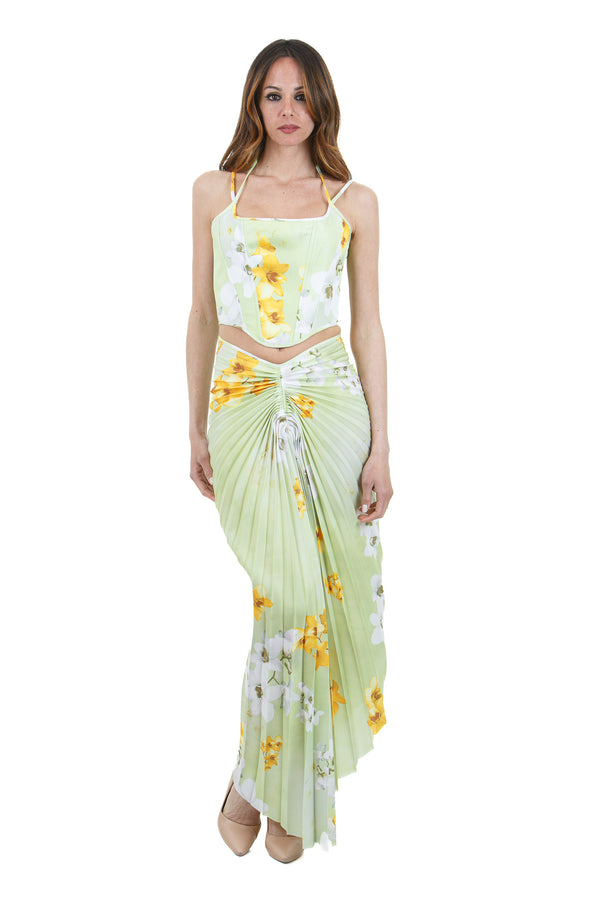 Gonna midi plissè con stampa floreale di PINKO. La silhouette della gonna è mossa da dettaglio arricciato e raccolto in vita e fondo capo con orlo asimmetrico, più lungo su un lato rispetto all'altro. La zip invisibile laterale su un fianco aiuta e facilita l'indosso