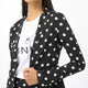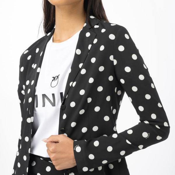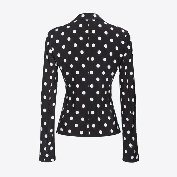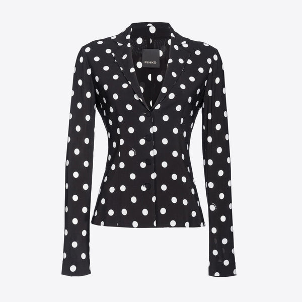 Blazer dalla linea aderente in georgette di viscosa stretch con stampa pois all-over. Collo con rever piccolo, maniche lunghe e chiusura monopetto con bottoni.