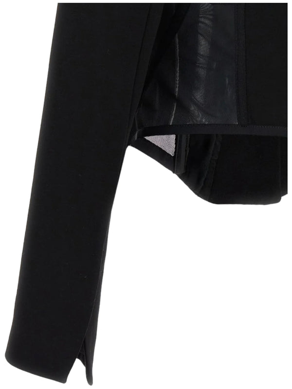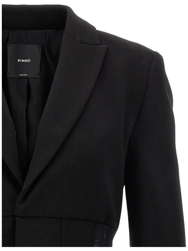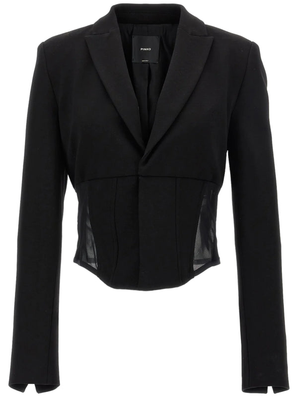 PINKO Giacca monopetto in tessuto tecnico di viscosa stretch con inserti in tela e tulle semitrasparente. Chiusura a bustier con ganci in metallo davanti. La modella indossa una taglia 40 ed è alta 170cm. Questo capo non si lava e si consiglia un lavaggio ed una stiratura a media temperatura. Stagione autunno inverno.