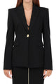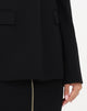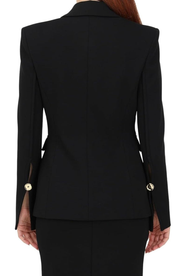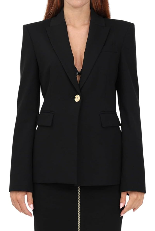 Blazer in viscosa stretch lavorata a punto stoffa. Linea avvitata, più stretta sui fianchi, con spalle strutturate, collo a revers, maniche lunghe con spacco e bottone sul retro e tasche frontali con patta. Interno foderato in tessuto tecnico. Chiusura monopetto con bottone.