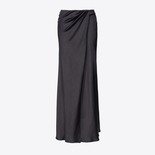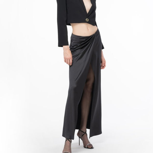 Gonna lunga dalla linea sgivalata in raso martellato, dal particolare effetto tridimensionale. Silhouette incrociata che crea profondo spacco davanti. Chiusura con zip invisibile nel centro dietro.