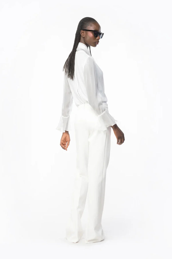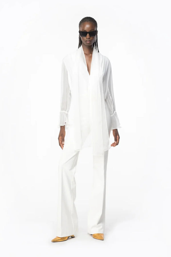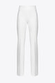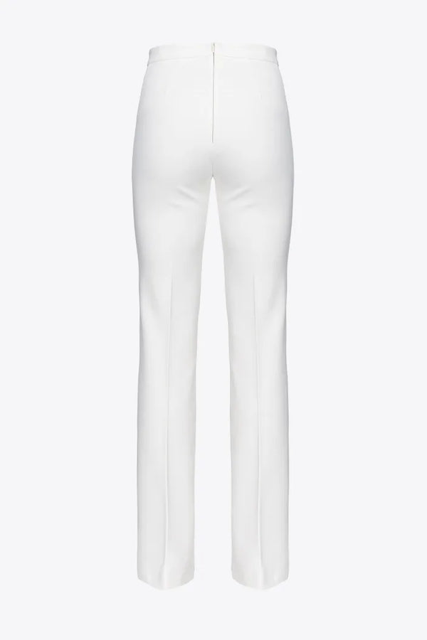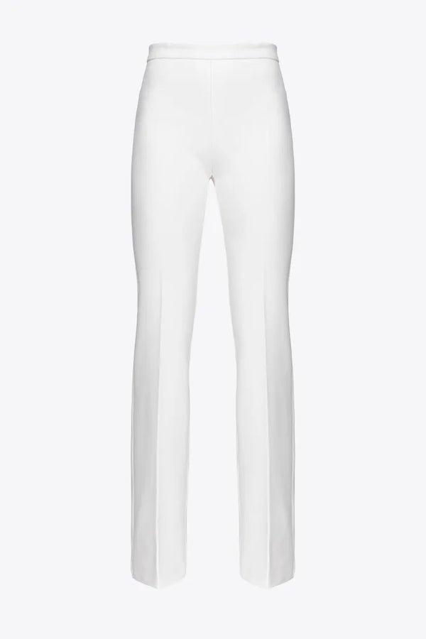 Pantaloni dal design elegante in tessuto crêpe tecnico stretch. Vita regular e gamba dalla linea aderente, svasata al fondo, con piega centrale sia davanti che sul retro. Chiusura con zip invisibile nel centro dietro.