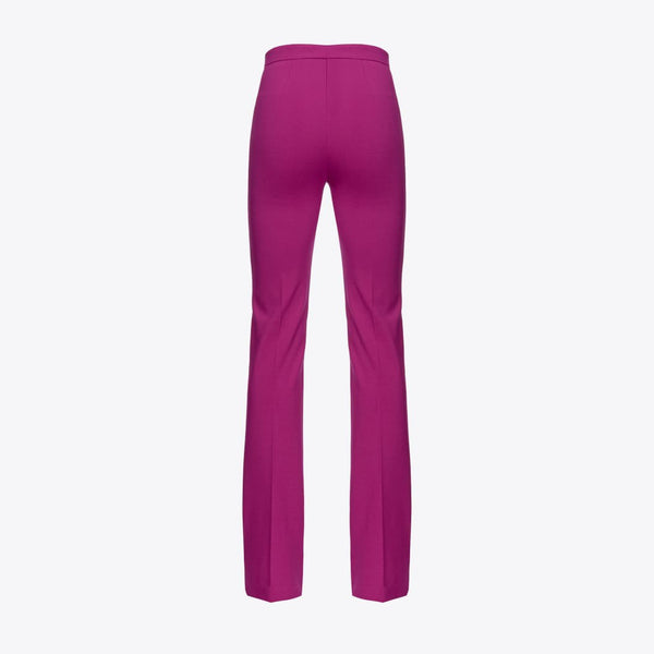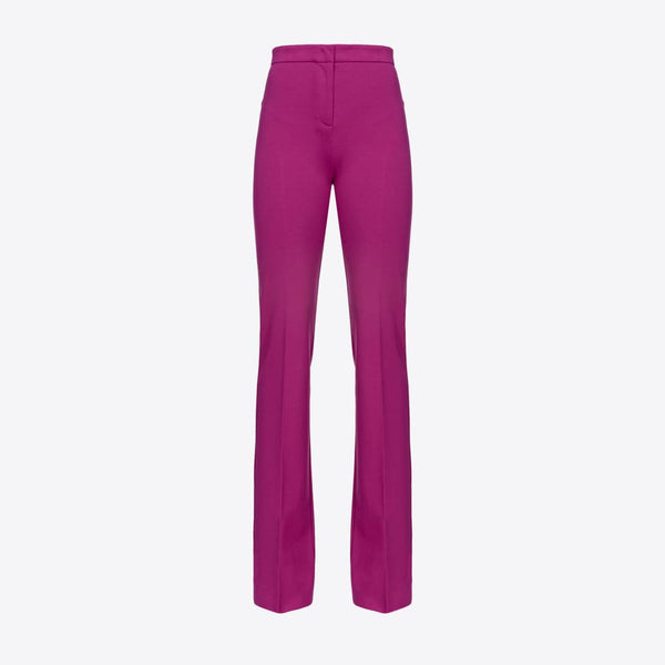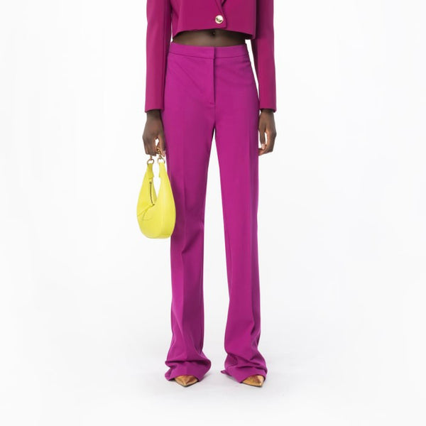 Pantaloni flare-fit in tessuto di viscosa stretch lavorato a punto stoffa. Vita alta e gamba dalla linea svasata con piega centrale. Chiusura con zip e piccolo gancio.
