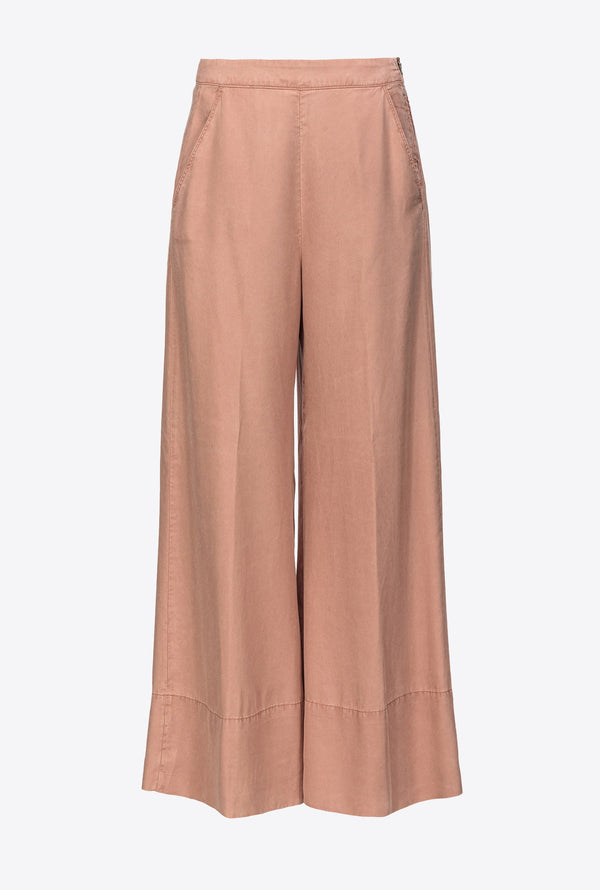 Pantaloni wide-leg in tessuto twill lyocell. Vita alta, tasche alla francese davanti e piccolo ricamo con logo PINKO laterale. Gamba dalla linea ampia con orlo cucito effetto maxi risvolto. Chiusura con zip laterale in metallo.
