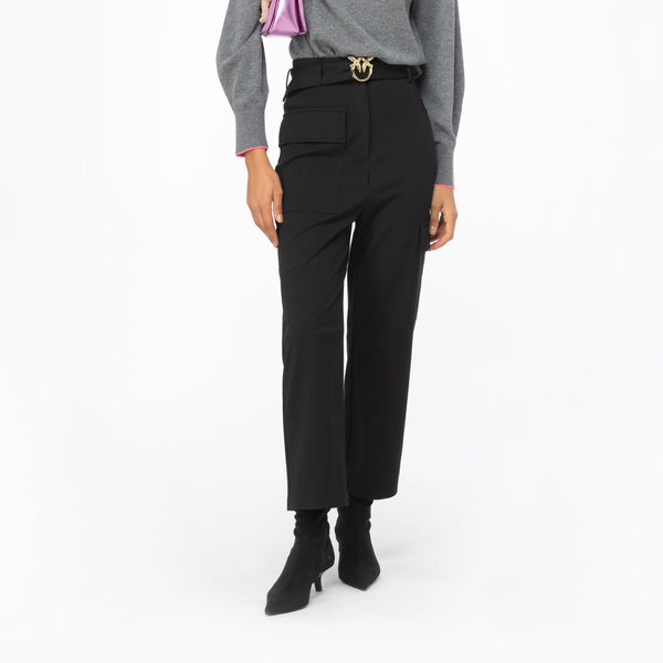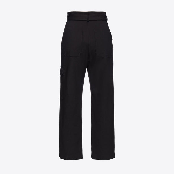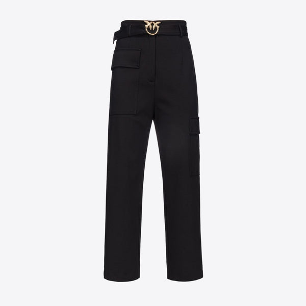 Pantaloni cargo in tessuto tecnico di viscosa stretch lavorato a punto stoffa. Vita alta con passanti per cintura e cintura abbinata allo stesso tessuto con fibbia Love Birds Diamond Cut, tasche inserite sui fianchi e a toppa sul retro. Gamba dalla linea dritta, leggermente ampia con maxi tasche utility applicabili sui lati. Chiusura con zip e piccolo gancio.