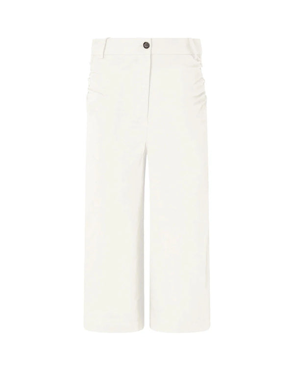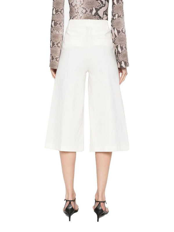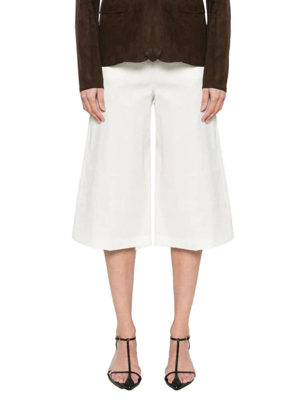 Pantaloni bermuda, lunghi a metà polpaccio, dal volume ampio realizzati in tessuto di lino stretch, perfetti per il periodo estivo. La linea ampia dei pantaloni cropped risulta svasata verso il fondo, costruendo una shape a trapezio. Chiusura con bottoni e zip coperta. Indossa i bermuda con il top corto abbinato, nello stesso tessuto, per un total look da giorno femminile con un tocco originale.