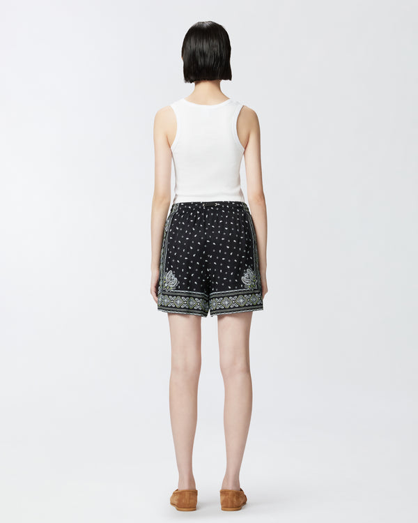 Pantaloncini shorts da donna realizzati in leggero tessuto twill di viscosa personalizzati con stampa che riproduce il classico pattern bandana, per un tocco estivo e divertente. Gli shorts sono caratterizzati da vita con elastico e laccetti da stringere e gamba dalla linea ampia, ariosa e perfetta per l'estate. Abbina i pantaloncini corti a un blazer e a un paio di mocassini per ottenere un look da giorno da idnossare nelle giornate di sole, per sognarti già in vacanza.