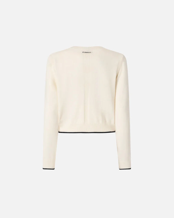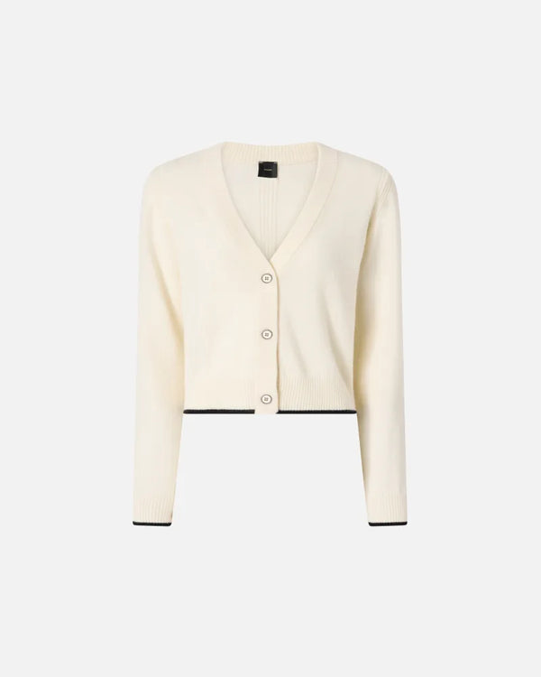 Cardigan realizzato in soffice misto di lana merino e cashmere con scollo a V, orlo e polsini lavorati a coste. Il filato a contrasto mette in risalto i polsini e l'orlo, mentre la caratteristica etichetta con logo lettering PINKO completa il design. Il capo è stato sottoposto a prove di finissaggio per ridurre al minimo la possibile formazione di pilling, garantendo una maggiore morbidezza e durabilità del tessuto. Essenziale e contemporaneo, questo design diventerà un vero e proprio passe-partout.