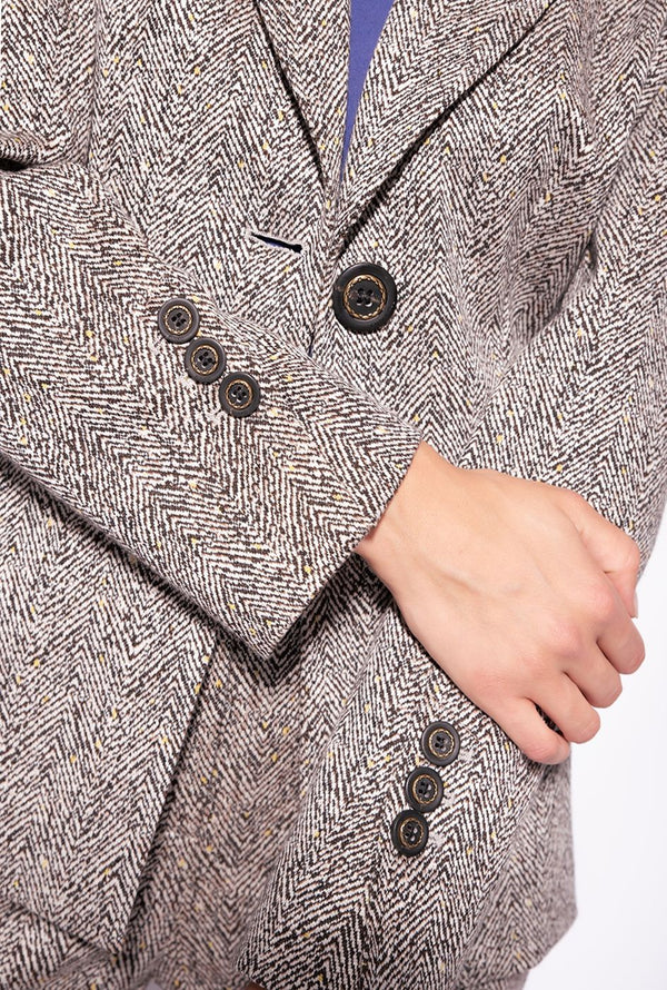 Blazer con collo reverse, due tasche con patta sul davanti e chiusura frontale con bottone. Colore: beige/marrone
