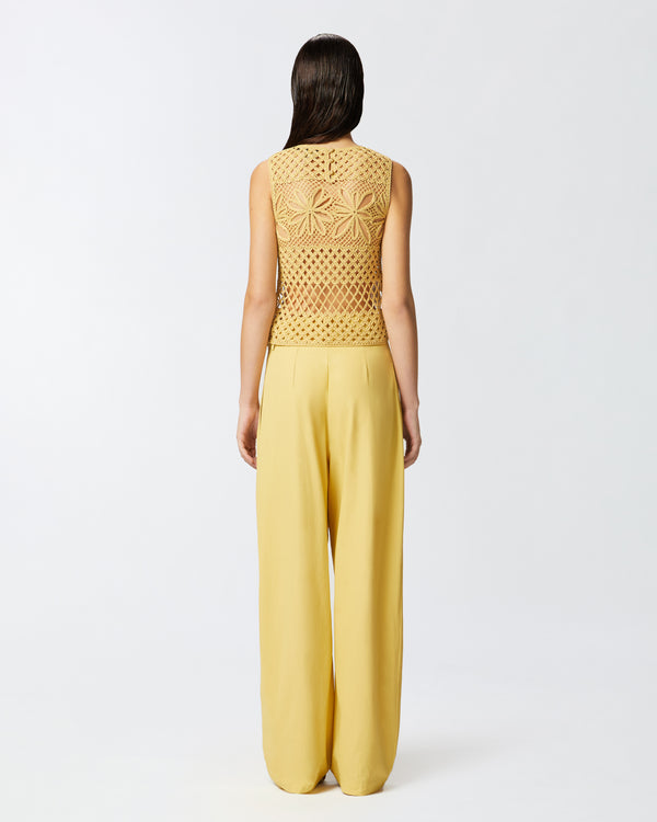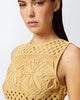 Top smanicato dalla linea dritta realizzato in filato rete crochet traforato fantasia, dove un pattern a rombi si alterna a un particolare disegno floreale, femminile ed estivo. Il top dalla texture trasparente è completato da scollo tondo chiuso con tre piccoli bottoni sul retro del collo, ed è ideale per completare anche il look più formale con un tocco originale e solare.