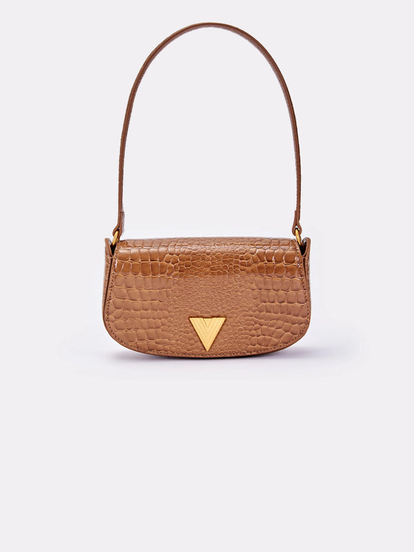 Borsa Clap a spalla ecopelle effetto "coco" in vernice. Manico rigido in similpelle. Chiusura a pattina con bottone a pressione con calamita. Dettaglio logo V metal plate Vicolo. Finiture anticate color oro. Tasca interna con cerniera e taschina piatta.