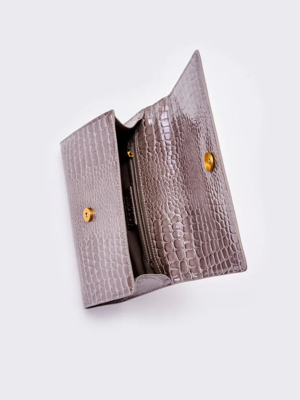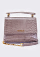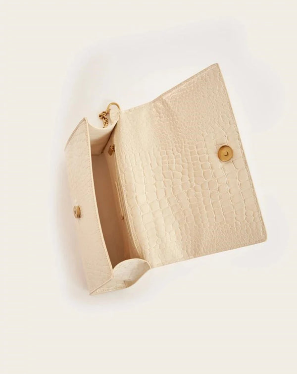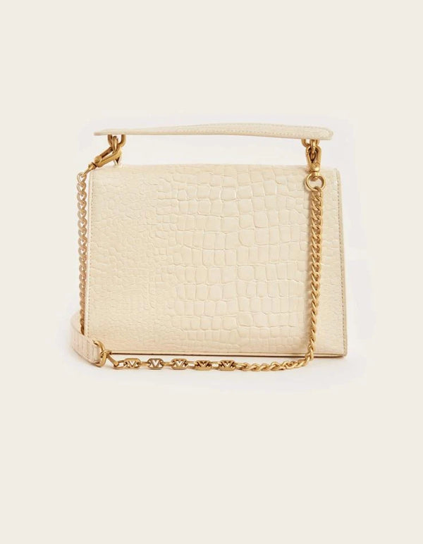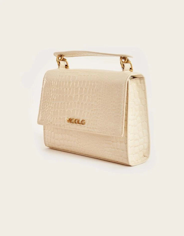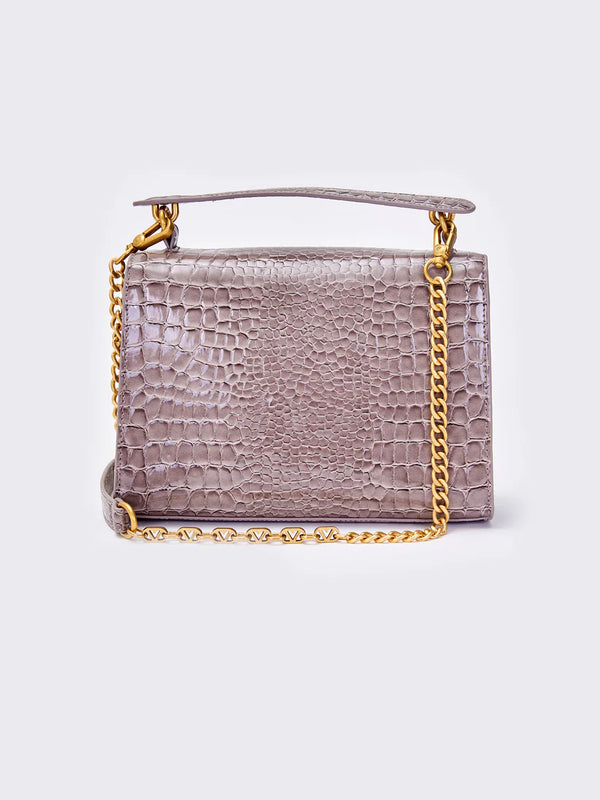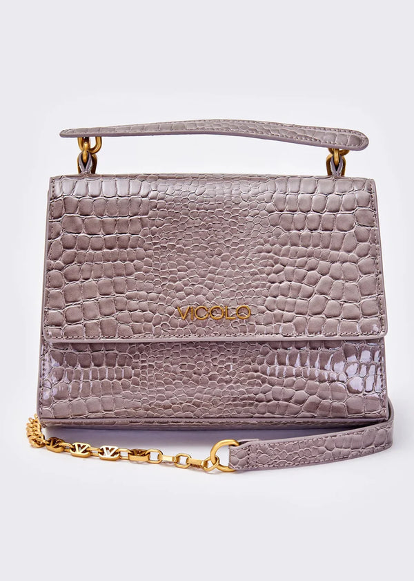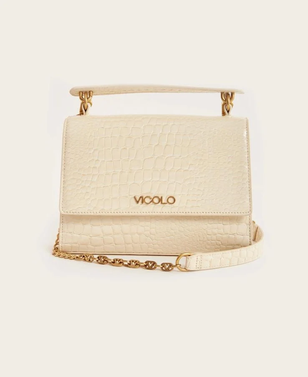 Borsa Portobello a tracolla in ecopelle effetto "coco" in vernice. Chiusura a pattina con bottone a pressione con calamita. Dettaglio logo metal plate Vicolo. Tracolla con catena removibile con dettaglio catena logata. La borsa può essere indossata come borsa a spalla, a tracolla e come borsa a mano. Dettaglio finiture anticate color oro. Tasca interna con cerniera.