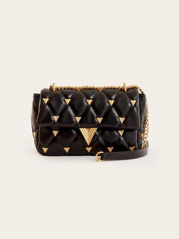 Borsa Prisma a tracolla in ecopelle trapuntata con borchiette V metal plate. Chiusura a pattina con bottone a pressione con calamita. Dettaglio fibbia V metal plate Vicolo. Tracolla con catena scorrevole, la borsa può essere indossata sia come borsa a spalla che come borsa a tracolla. Tasca interna con cerniera e taschina piatta interna. Finiture anticate color oro.