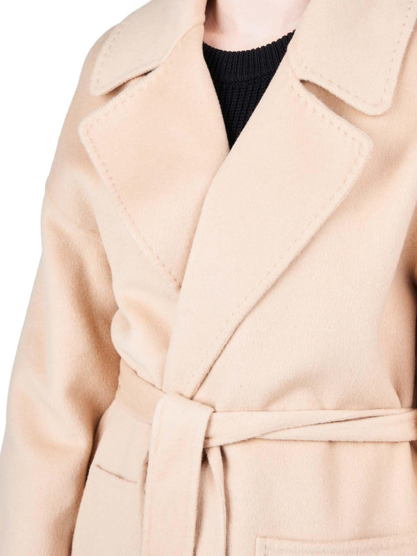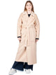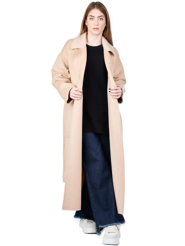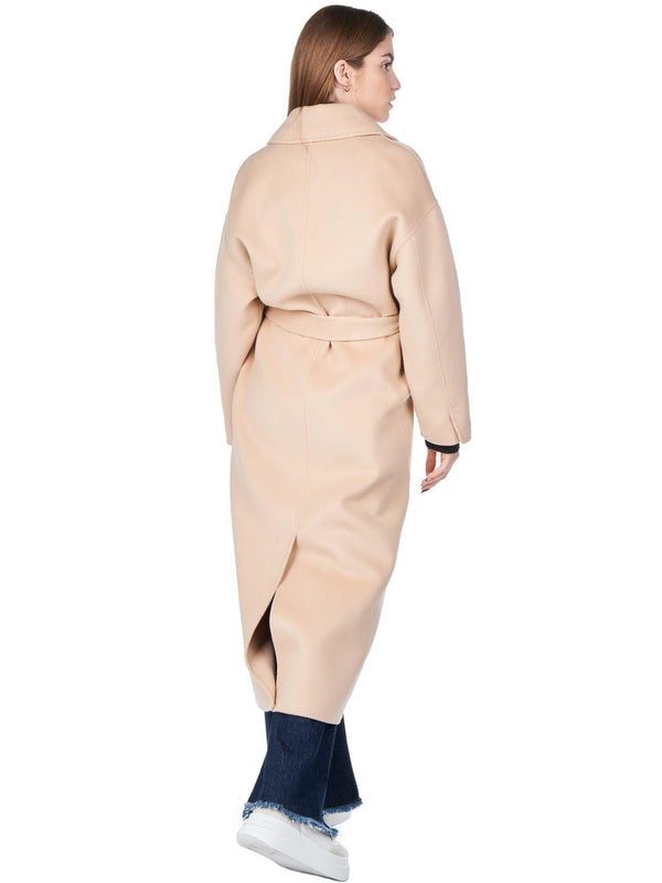 Cappotto lungo oversized con colletto a revers e tasche laterali a pattina. Chiusura frontale con bottoni nascosti con cintura abbinata.