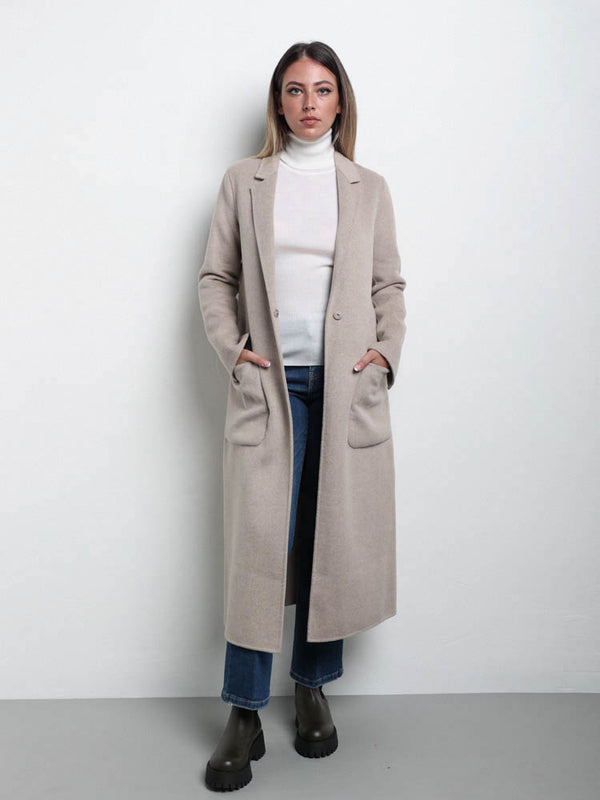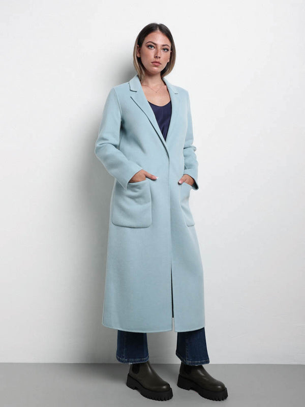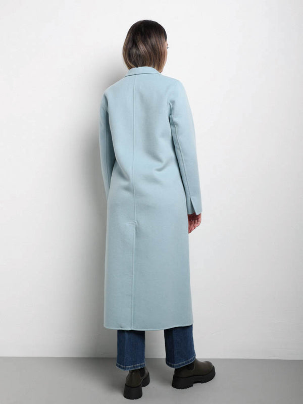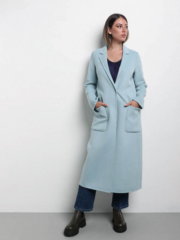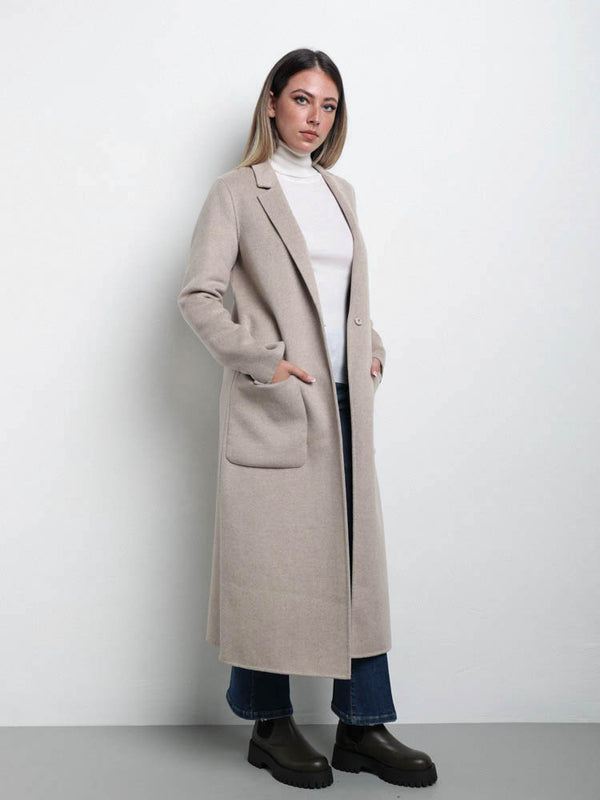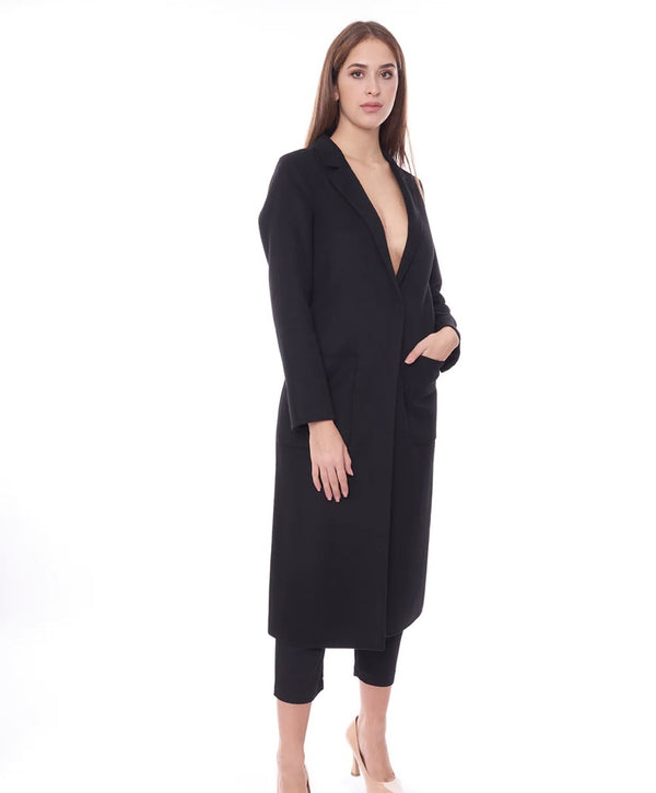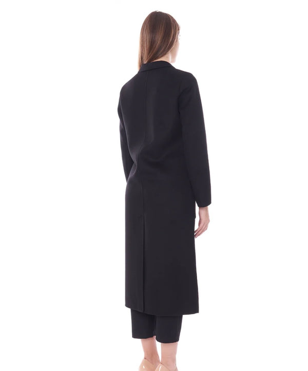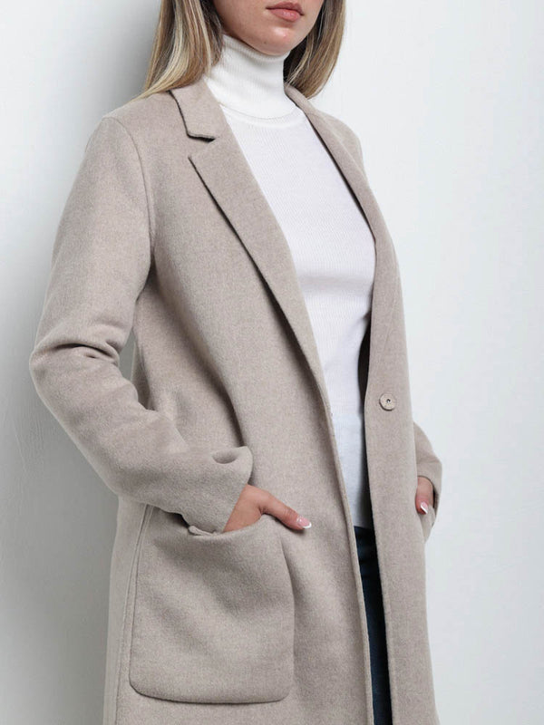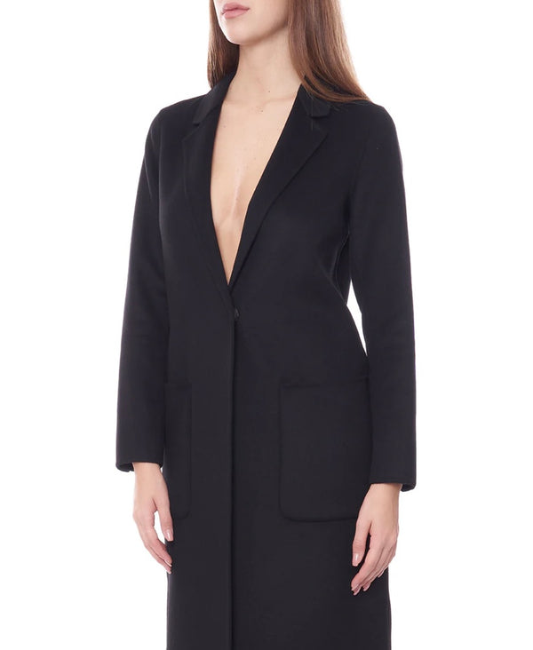 Cappotto in misto lana con colletto a revers e maniche lunghe. Tasche anteriori applicate. Chiusura frontale a un bottone nascosta.