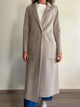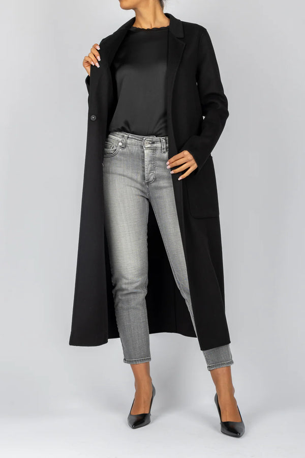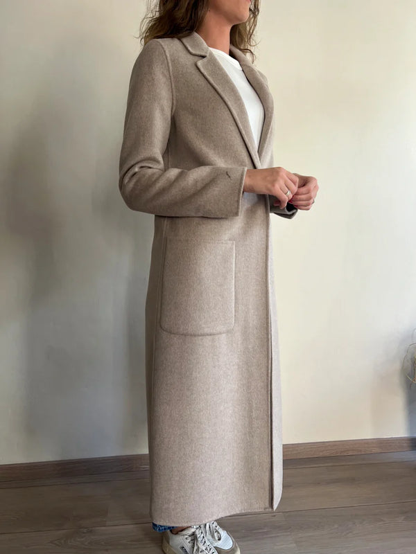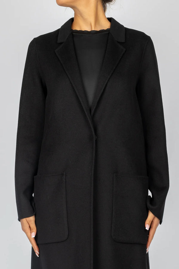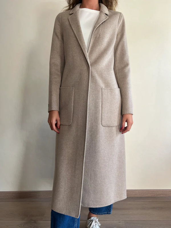 Il cappotto lungo Vicolo, realizzato con una silhouette semplice e pulita, presenta una chiusura con bottone frontale e due tasche laterali. Il design minimalista è completato da un colletto classico che aggiunge un tocco di eleganza. La lunghezza oltre il ginocchio offre una copertura ottimale, rendendolo ideale per l'uso quotidiano durante i mesi più freddi.
