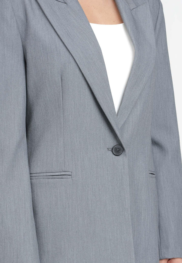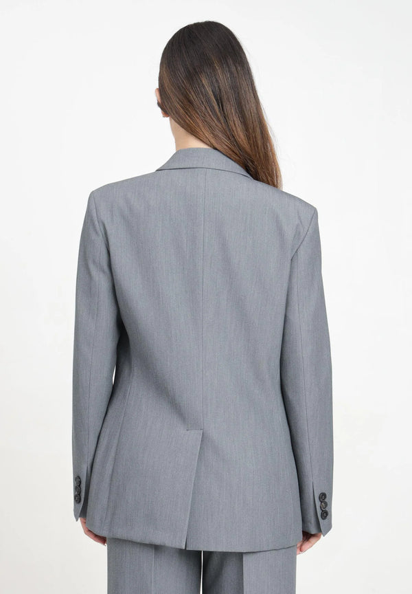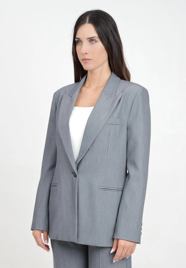 VICOLO Giacca monopetto grigia da donna. Il capo presenta una chiusura con un solo bottone frontale, che mantiene una linea pulita e raffinata. I revers classici aggiungono un tocco formale, mentre le tasche con pattina a filo contribuiscono a mantenere uno stile minimalista. La struttura della giacca offre una vestibilità comoda e contemporanea, perfetta sia per un look da ufficio formale che per un outfit più casual se abbinata a pantaloni coordinati o a capi contrastanti. La modella indossa una taglia S ed è alta 170cm. Si consiglia una stiratura a media temperatura. Stagione autunno inverno.