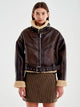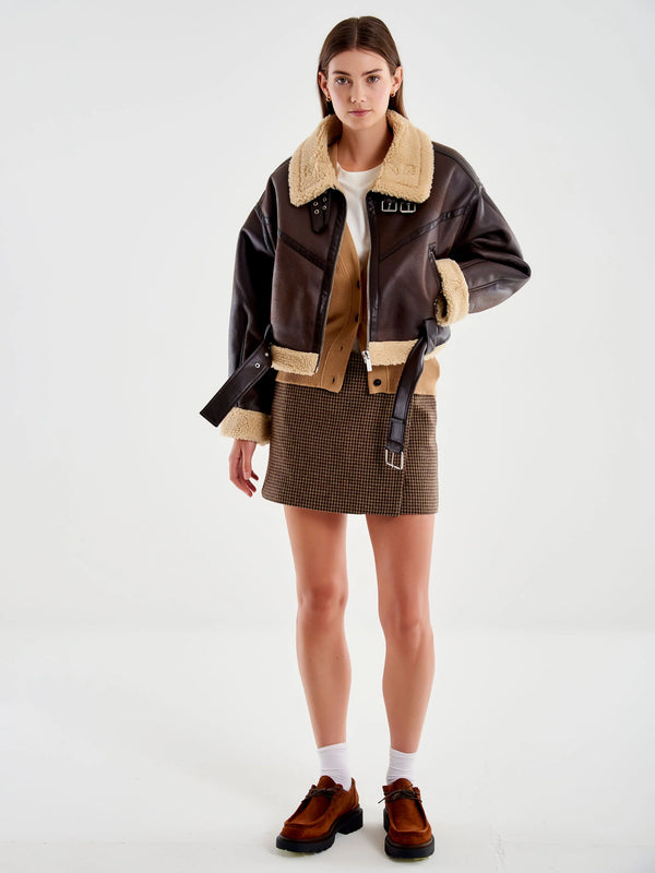 Giubbotto biker con esterno effetto scamosciato ed interno in ecopelliccia chiara. Maniche lunghe con polsino con risvolto. Collo a revers con dettaglio fibbia e laccio. Chiusura con zip frontale e cintura. Tasche frontali con zip. Cropped.