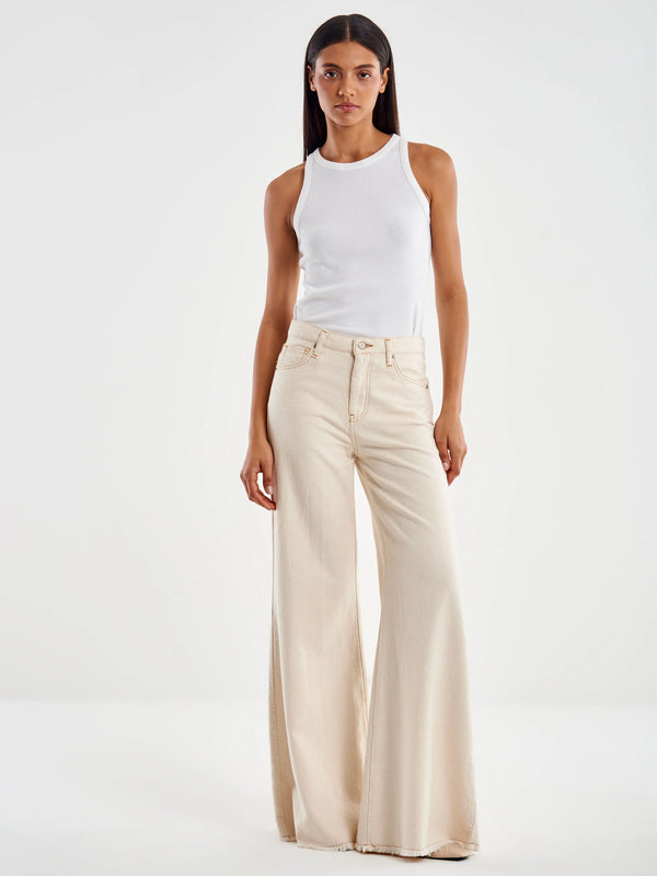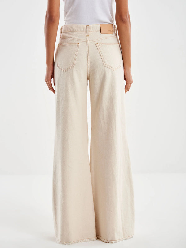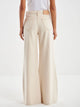 Jeans a palazzo ampio con vita alta e passante. Gamba lunga. Con tasche anteriori e posteriori. Chiusura frontale con cerniera e bottone. Fondo sfrangiato. Denim Beige.