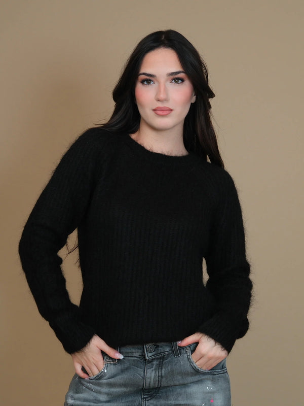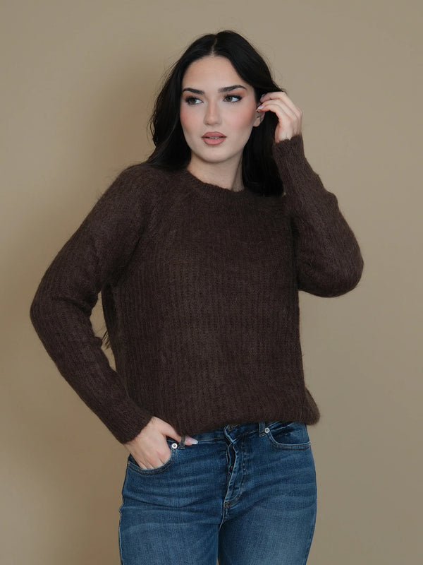 Maglione basic Vicolo, colore marrone, girocollo, polsini e orlo elasticizzati a coste. La modella indssa la taglia unica ed è alta 1,70cm.Composizione: 42%Acrilica, 30%mohair, 28%poliammide
