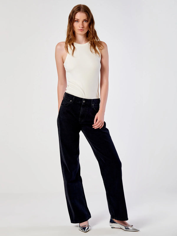 Jeans a vita regolare. Modello cinque tasche. Gamba larga extra lunga. Chiusura frontale con zip e bottone.
