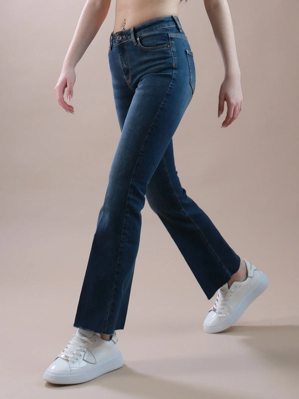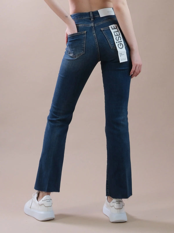 Jeans a vita media con fondo a zampa nero. Modello cropped. Modello cinque tasche. Chiusura frontale con zip e bottone. Dettaglio fondo leggermente sfrangiato.