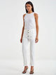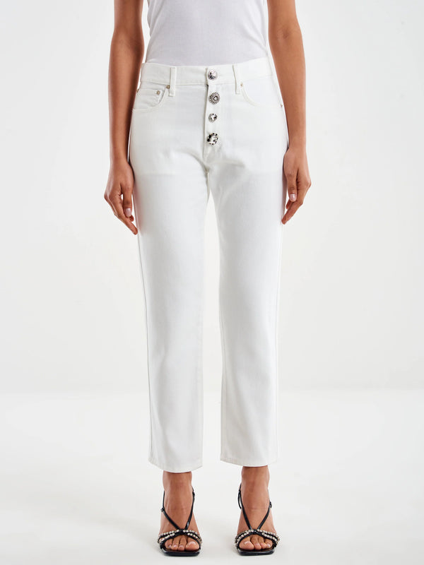 Jeans a vita bassa baggy. Modello cinque tasche. Chiusura frontale con bottoni gioiello e zip nascosta. Denim Bianco
