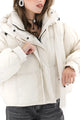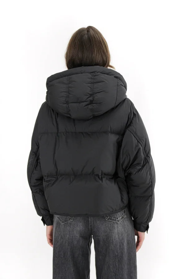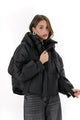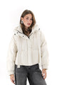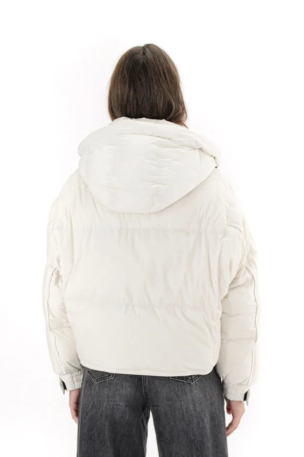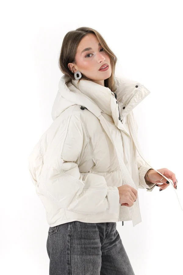 Giubbotto imbottito cropped oversized a maniche lunghe con cappuccio. Tasche laterali a filetto. Laccio over passante per cappuccio. Maniche regolabili con velcro. Chiusura frontale con cerniera e bottoni a pressione. Fondo regolabile con elastico.
