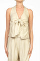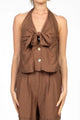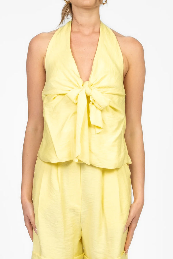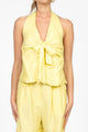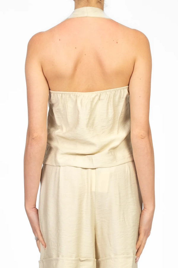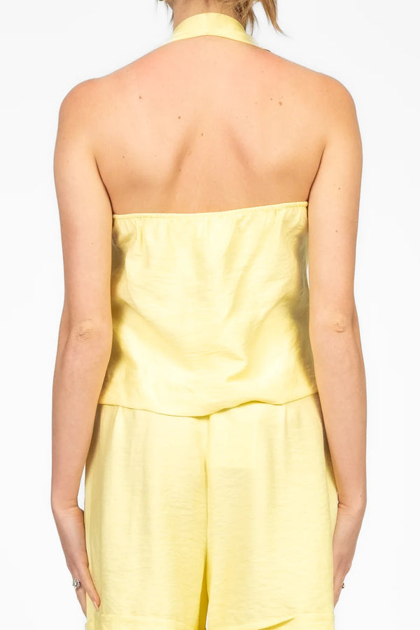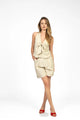 - Completo fresco e femminile composto da un top con scollo posteriore e dettaglio fiocco frontale, arricchito da un elastico sullo scollo che assicura comfort e una vestibilità stabile. Il bermuda abbinato presenta pinces frontali che donano struttura al capo, due tasche laterali funzionali e un elegante risvolto sul fondo. Un look estivo curato nei dettagli, perfetto per un’eleganza disinvolta da giorno a sera.
