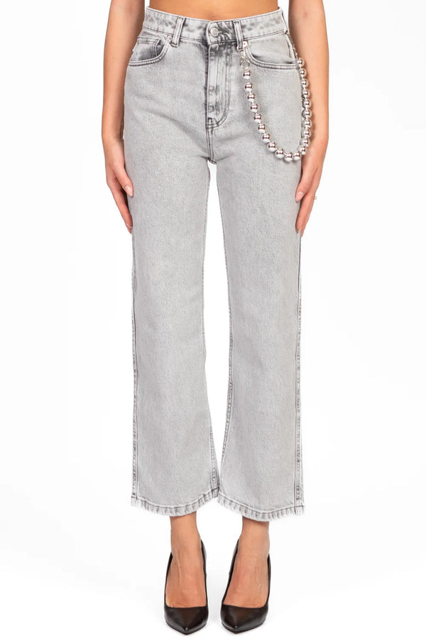 - Jeans a gamba dritta cropped, leggermente elasticizzati per garantire comfort e libertà di movimento. La vita alta valorizza la silhouette, mentre il taglio moderno alla caviglia li rende perfetti per look attuali e versatili. Il design a cinque tasche è arricchito da una decorazione con catena di perle removibile, un dettaglio raffinato che aggiunge un tocco di originalità al capo. Chiusura con zip e bottone.