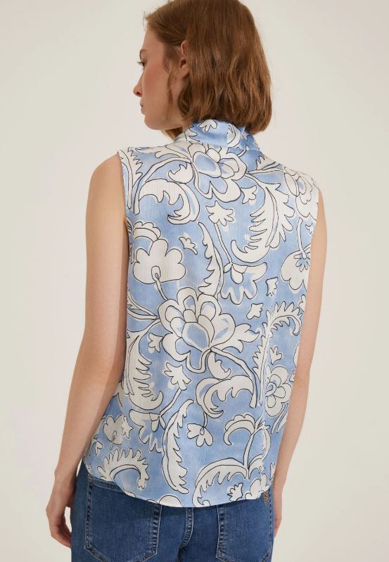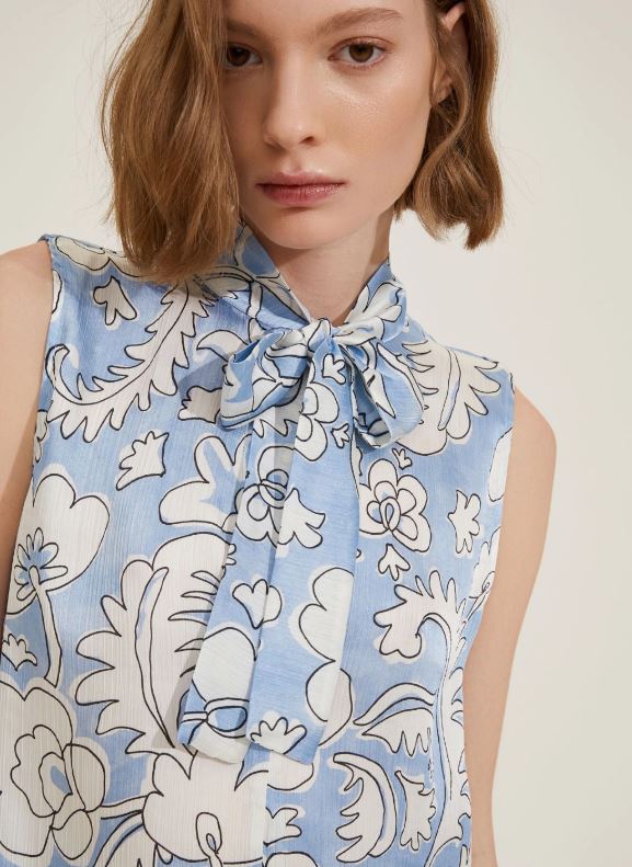Semplice nelle linee, sofisticato nei dettagli: il top smanicato sfoggia uno scollo con nodo e una luminosa stampa foliage, per introdurre con eleganza la nuova stagione.