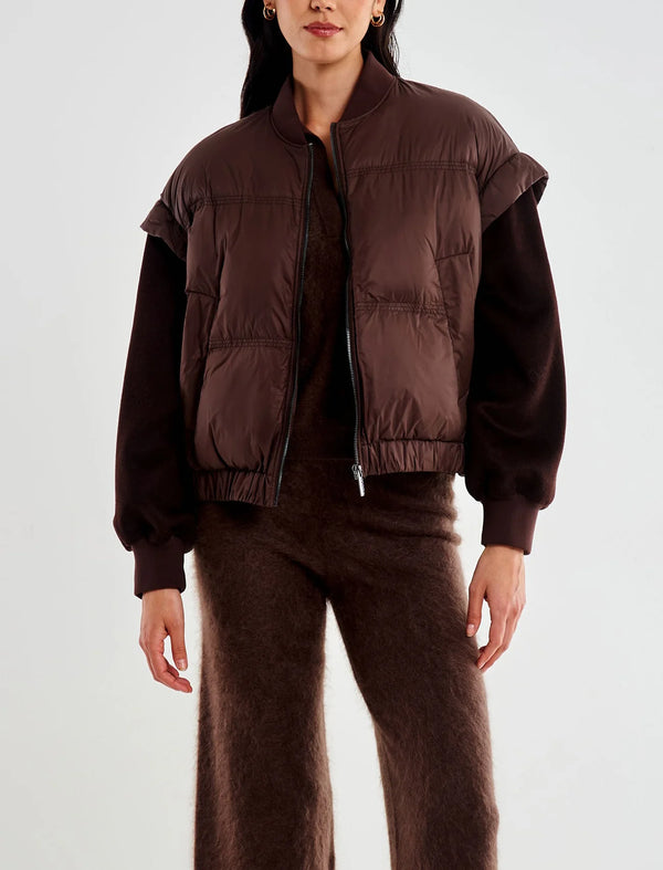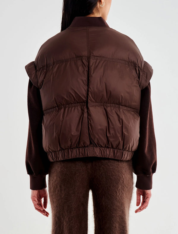 Piumino corto modello bomber con colletto alla coreana. Maniche in panno con polsino stretto. Chiusura frontale con cerniera. Tasche laterali alla francese. Dettaglio elastico sul fondo.